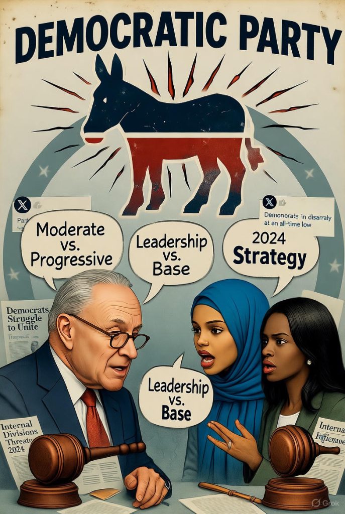 The party’s ideological spectrum stretches from the progressive “Squad” to moderate centrists, hampering unity. Public disputes over Israel aid, shutdown tactics and “defund the police” reforms have turned internal debates into a visible “civil war” on social media. With President Biden’s advancing age and Vice‑President Harris’s brief tenure, there is no clear successor to rally the base; 45 % of Democrats now prefer a moderate over a progressive candidate, yet the “Marxist Left” retains strong influence in primary contests.