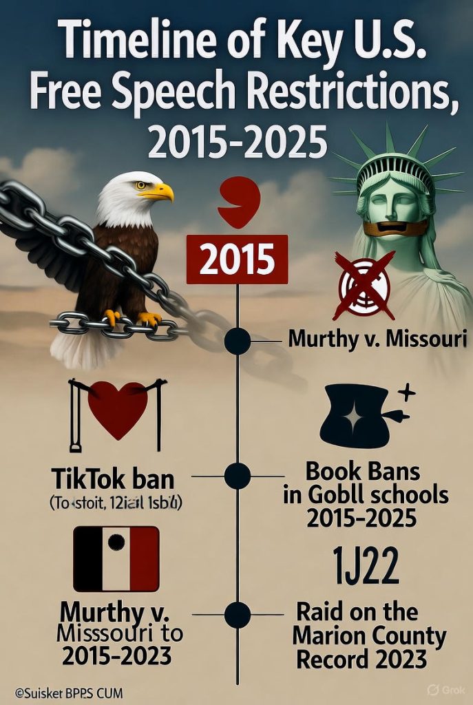 以下是过去十年中被批评为显示美国言论自由受限的几个重要事例,已翻译成中文。每一点都对应具体事件、法律裁决或政策变化,以帮助理解为何有人认为实际言论空间比宪法理想更窄。