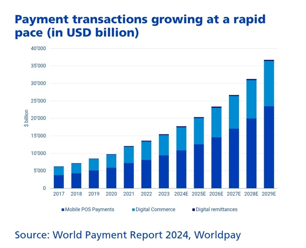 | Growth in transaction volume | Worldpay forecasts payment volumes exceeding USD 36 trillion by 2029, driven by POS, e‑commerce, and digital money transfers. |